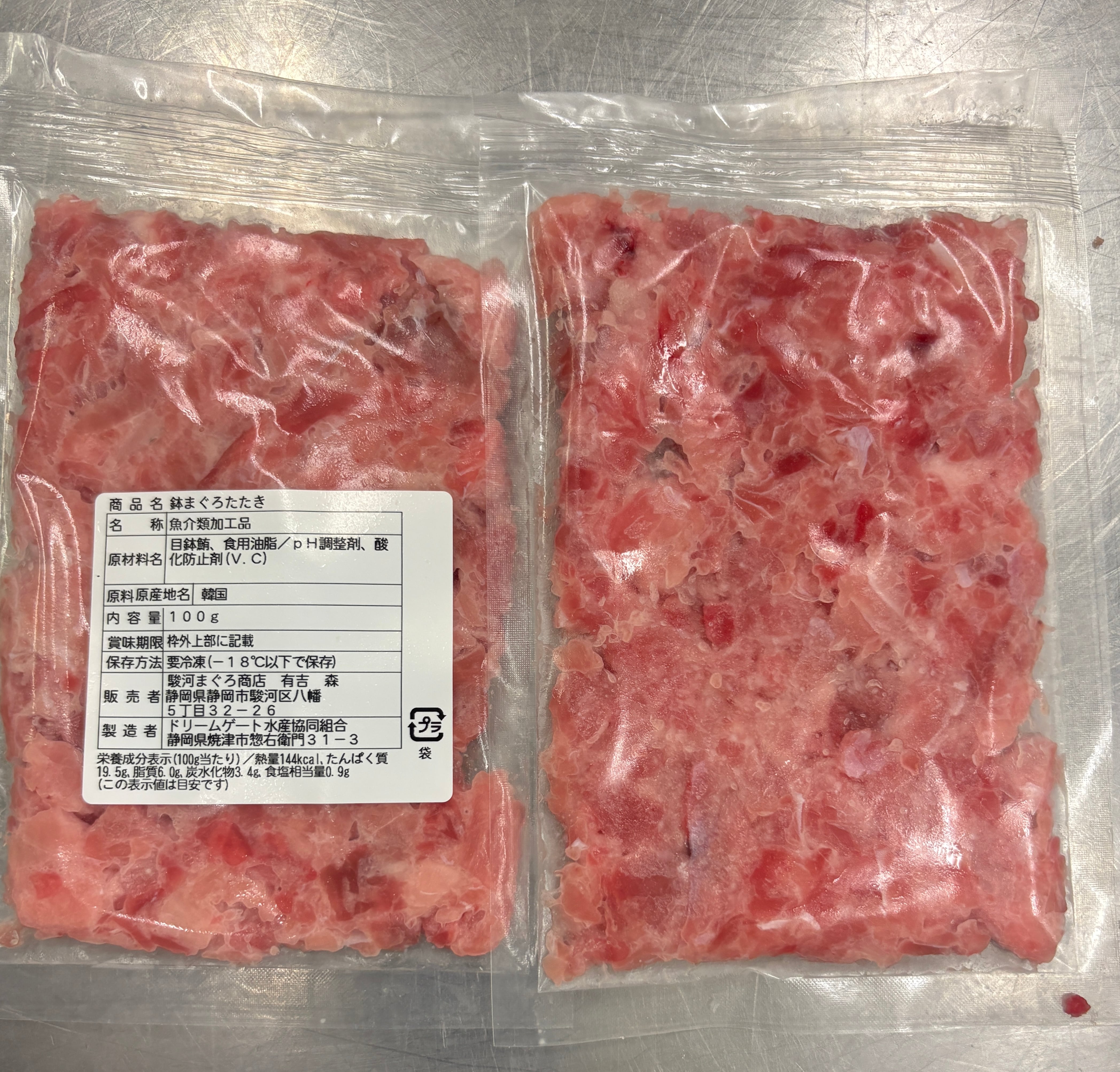 普段身近な場所で販売されている一般的なまぐろたたき(ネギトロ)と見た目の色が全く違います。実はこれが本物の色、味を楽しめるマグロたたきです。その理由は、熟練の職人の原料選びによる魚種めばち鮪100%使用し、添加物となる着色料や増粘剤を不使用。植物油も製造で必要な最低限の使用して植物油を普段気にされている方でも「このマグロたたきなら食べれる」と多数のご意見を頂いております。